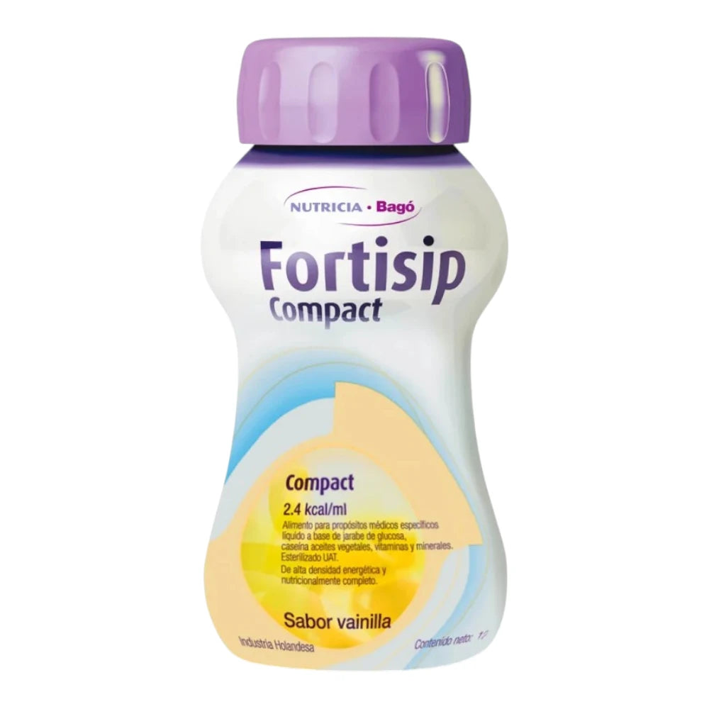 Fortisip Compact es un suplemento nutricional de alta densidad energética y de nutrientes (2,4 Kcal/ml), por lo que su valor nutricional es similar a un suplemento estándar de 200 ml (1.5 kcal/ml 16% de energía proteica) en un volumen 40% menor, de 125 ml, lo cual contribuye en aumentar la adherencia y cobertura de requerimientos nutricionales.