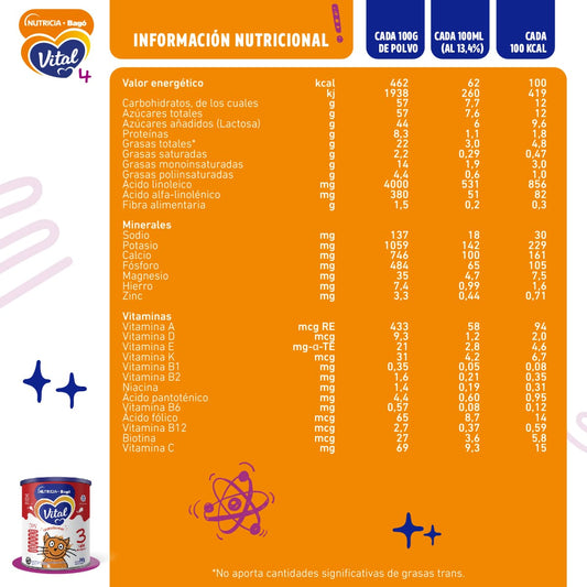 Leche modificada en polvo, para niños a partir de los 2 años. Libre de Gluten. Complementa la alimentación de niños mayores de 2 años. No es un sucedáneo de la leche materna.